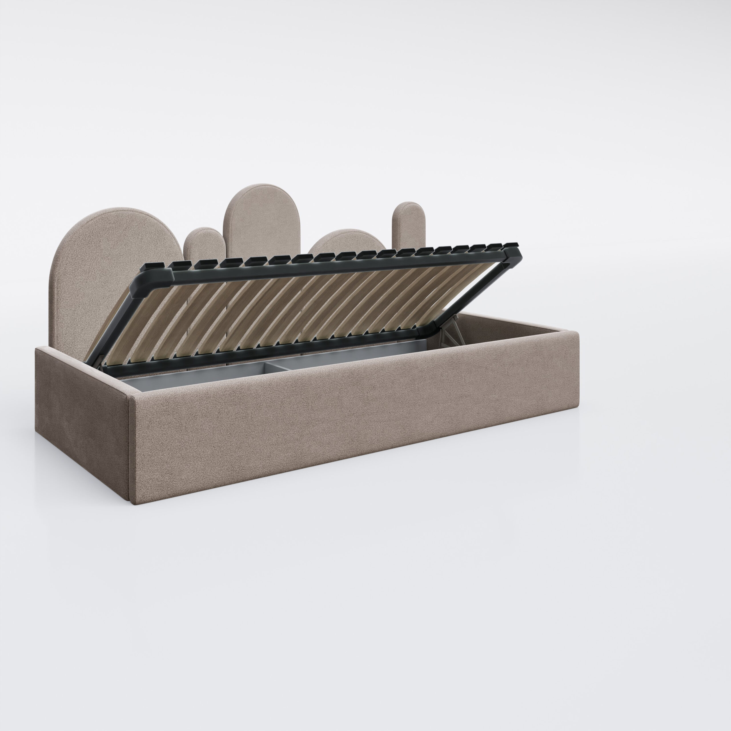 Pojedyncze łóżeczko Safi to nowoczesna, miękka forma zaprojektowana z myślą o dzieciach i spokojnych, harmonijnych wnętrzach. Charakterystyczny zagłówek z rytmicznie ułożonych, zaokrąglonych paneli tworzy przytulną przestrzeń do snu i odpoczynku, jednocześnie nadając meblowi unikalny, rozpoznawalny wygląd.